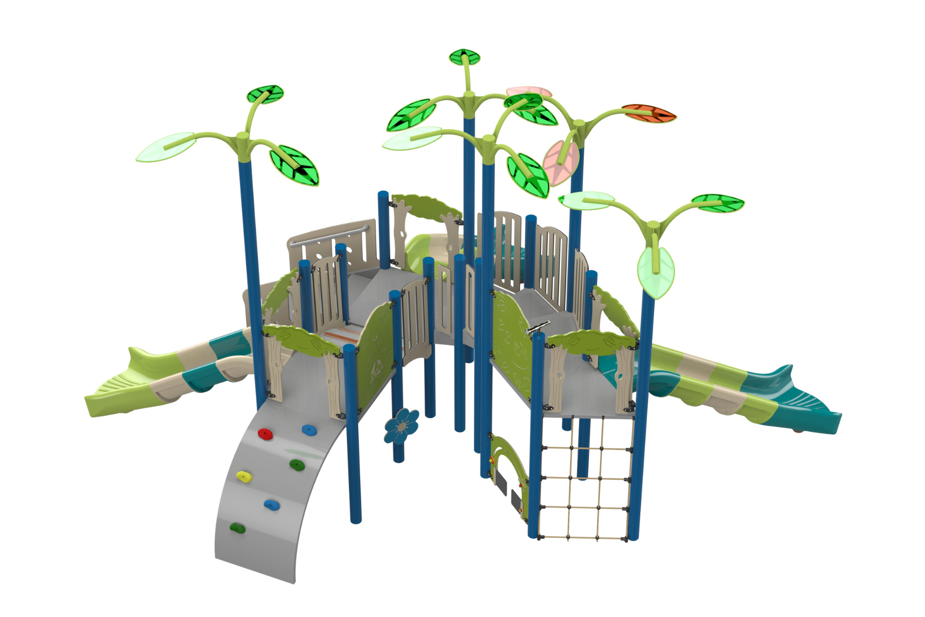 A designed and accessible combined structure including multiple climbing and sliding options and containing a large number of players simultaneously. Includes accessible stairs, tiered climbing surfaces, ladders, play panels, and a double slide to enhance the play experience. Suitable for imagination development games, physical development, and social intelligence development. Encourages curiosity and exploration, independence, spatial orientation, stage planning, and proper organization.