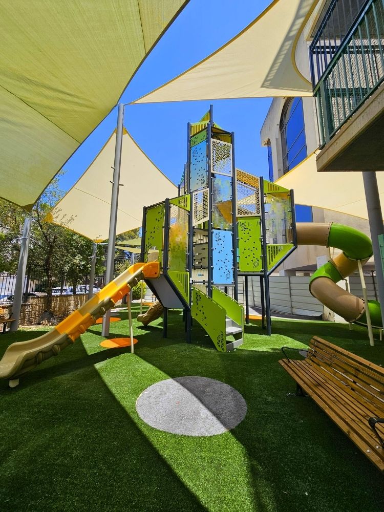 Set within a school environment, this play space was designed for two everyday rhythms: active use during school hours and relaxed community use after hours. At the centre of the site is a rich, multi level main structure with layered routes and moments of discovery, finished with semi transparent printed panels that bring light, colour, and curiosity into every corner.