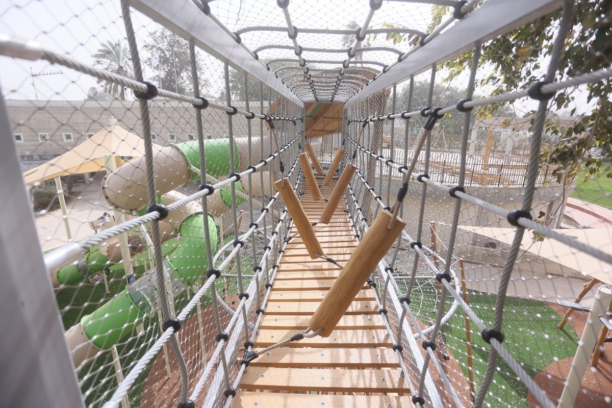 The composition includes elevated platforms, enclosed spiral slides, suspended rope bridges, circular climbing rings, and extensive net climbing areas that wrap the structure externally. Robinia wood was selected for its natural resilience and its ability to integrate harmoniously into open green environments.