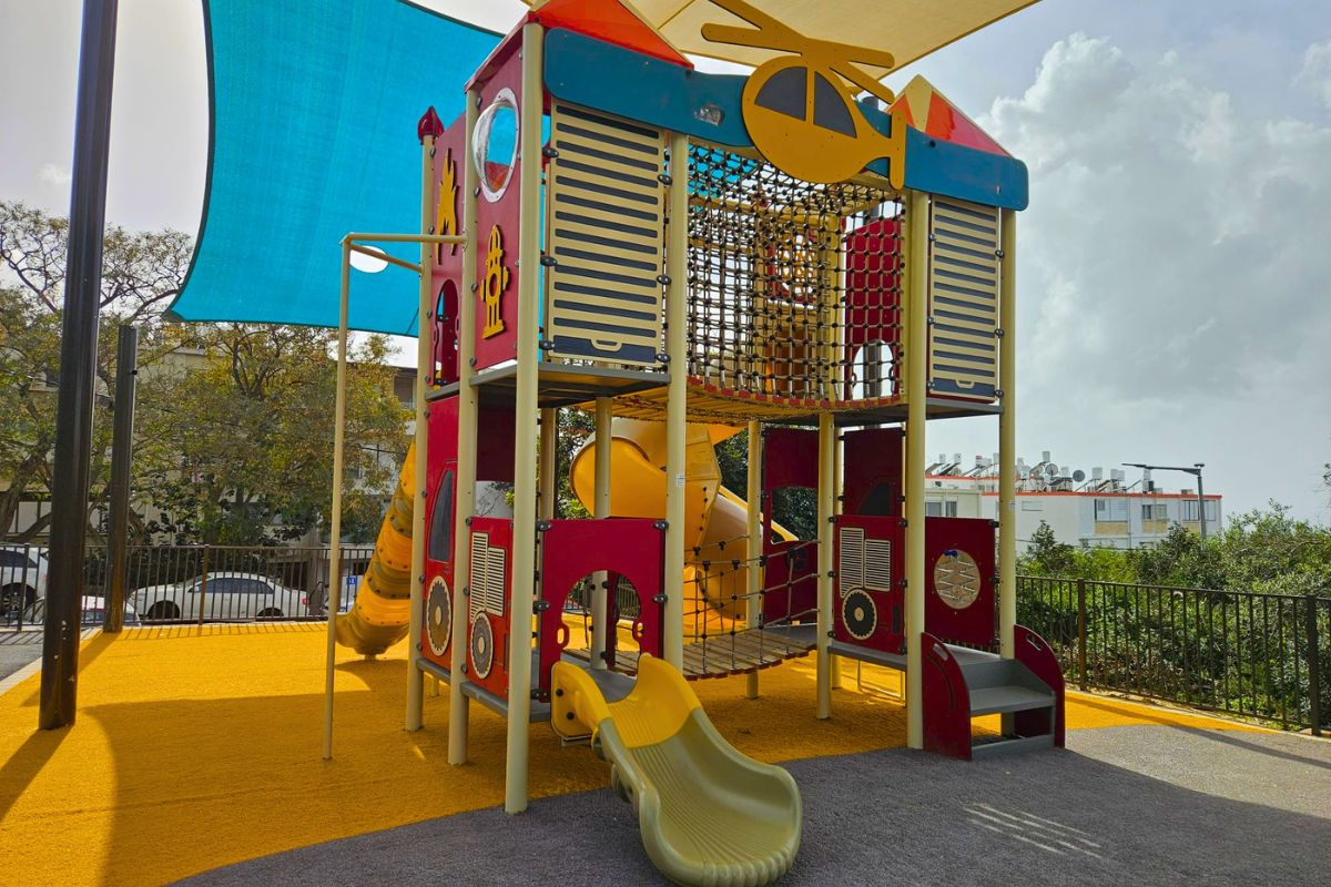 The playground also includes swings and a spaceship-shaped spring element, creating a varied play experience within one compact setting.